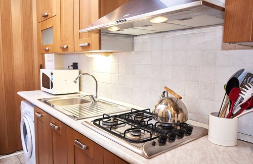 The kitchen has oven, gas cooker, microwave, washing machine.