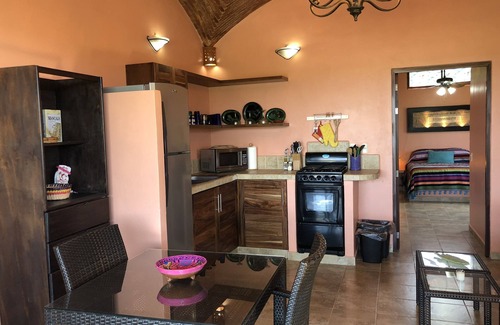 Casa Ventana al Cielo (House of the Window to the Heavens) is located in Sunny Sayulita Mexico. We have it all, great watersports, restaurants and small family owned markets and shops, You'll find no timeshares or mega resorts, just a little family friendly fishing village. The Casa has 4 bedrooms, 4 full and 2 half baths on 2 levels. It can be rented in its entirety or as 3 separate units. A 2 bedroom 2 bath unit is on the ground floor (El Sol) and two, one bedroom, one and one half baths units above (La Estrella and La Luna). Each unit has private access and fully equipped kitchens as well as a large terraces overlooking the pool, gardens and sweeping views of the Pacific ocean and the jungle. All the units are spacious, the 2 bedroom has about 1500 sq. ft., each one bedroom 750 sq. ft. All our bedrooms in the casa have AC units, El Sol features 2 custom king sized beds and a sleeper sofa The upper units each have a custom king size beds. All bedrooms boast an on suite bath. We have recently completed access to our third floor terrace with some of the most amazing views in town. A great place for a lsun set happy hour or late night stargazing! The new owners have even added an ionized water filtration system so the water in the entire home is safe to drink. The home is fully equipped to stay in during your entire vacation, cook, dine and relax on your terrace, swim in the saline pool, and enjoy the amazing views and sunsets. We also have beach towels, umbrellas, chairs and boogie boards for your use as the beach is about a 5 minute walk. Although we are located on the quiet North side of town no car is needed here. You are a 5-7 minute walk to the town plaza, beaches, markets and restaurants. Come visit us and see why we are a designated Pueblo Magico (Magic Village).