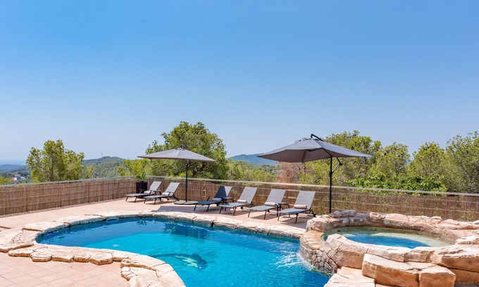 Perched on a hillside in the tranquil residential area of Can Suria, the villa offers breathtaking views that stretch across rolling hills to the sea in the distance, making every sunrise and sunset a spectacular event.