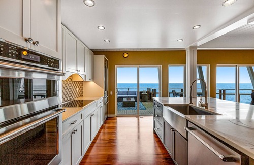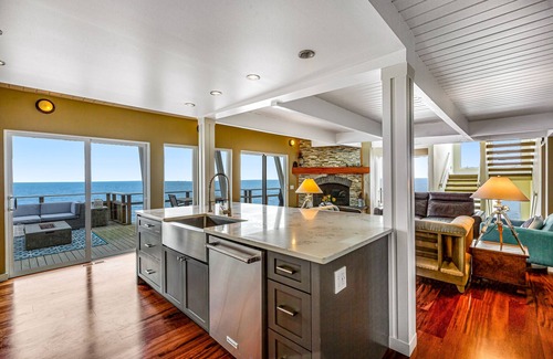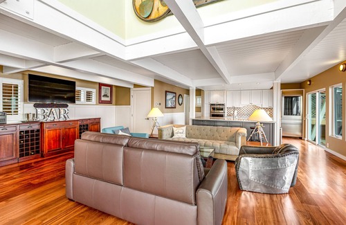 Upon entry, you'll be met with a bright interior and a warm feeling of welcome throughout the space. Make yourself at home in the stylish and contemporary living area by resting on the plush furniture, reading by the roaring fireplace, streaming your favorite movies, or serving up cocktails at the bar. Hobby chefs will love preparing grand meals and beach picnic snacks in the full kitchen, equipped with stainless steel appliances and a floating island breakfast bar.