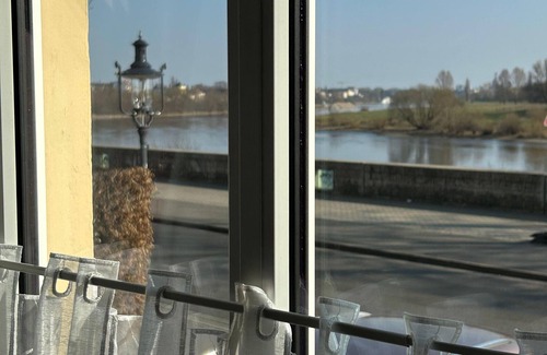 Nice spacious vacation apartment on the ground floor of the vacation home Ambiente on the Elbe, located directly on the Elbe and Elbe cycle path with a view of the Elbe and the old town and good connections to the highway, Dresden's old town and trad.