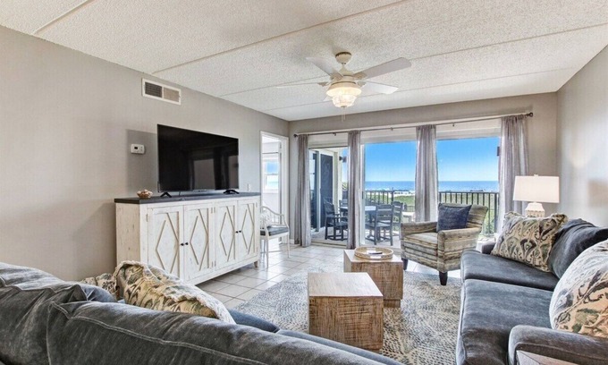 With two bedrooms, two bathrooms, and a spacious living area, there's plenty of room for everyone to spread out and enjoy the ocean views. All furnishings in the unit are new and tastefully selected. The main living area is equipped with a sofa, a love set, a chair, and a Smart TV with online streaming options through YouTube TV.