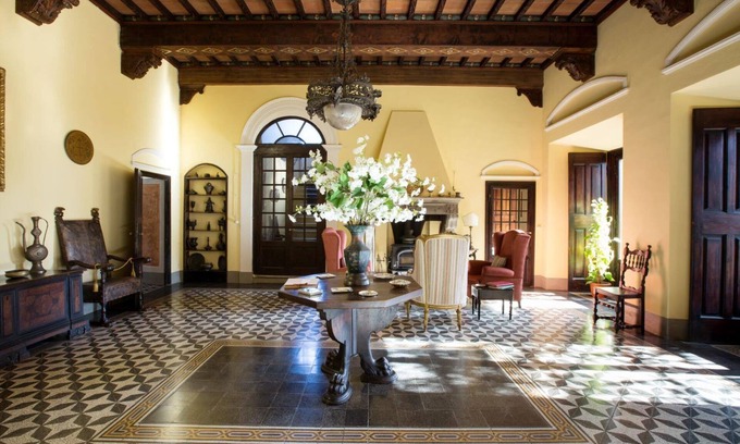 Upon entering the castle, guests are welcomed into an entrance hall with a stone fireplace, beamed ceilings and a reception throne that dates back to the 1500s. There are several lounge and living rooms with frescoed ceilings and comfortable seating, along with a dining room with antique fireplace and a large table that can accommodate up to 16 guests. Delicious feasts can be cooked up in the fully-equipped, country-style kitchen.