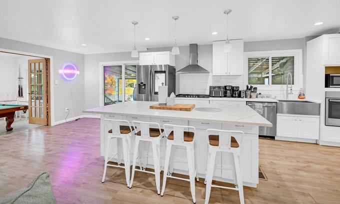 With four spacious bedrooms and two modern bathrooms an entertainment room that has it all for a memorable stay, "The Oasis" provides an inviting and comfortable retreat for families, groups of friends, or business travelers. Whether you're seeking a peaceful escape or a launching pad for your city adventures, this meticulously maintained home is sure to exceed your expectations. Fully loaded backyard with a basketball court, BBQ grill and Trampoline provides the perfect space for any traveler with luxurious Open Concept design.