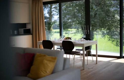 The apartment features a stylishly decorated double bedroom, enhanced by a beautiful French door that opens onto the surrounding nature, offering a complete immersion in the landscape.