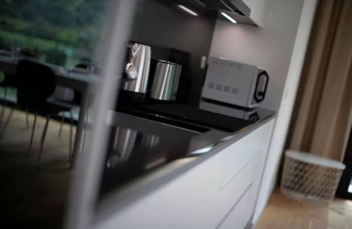 The space, bright and well-organized, ensures a practical and comfortable stay. The open-plan kitchen, fully equipped with modern appliances and kitchen utensils, is designed to meet all your needs. The dining table, placed next to the large French windows, offers a delightful view of the garden and mountains. The living area includes a comfortable sofa bed ideal for additional guests (Please note: the sofa bed is not prepared, we think it is proper to use the sofa during non-sleeping hours. You will find sheets, pillows and blankets in the closet/shelf most adjacent to the sofa.), a wooden armchair, and a smart TV. To complete the living area, a spacious covered patio perfect for relaxing in the greenery in total privacy and tranquility.