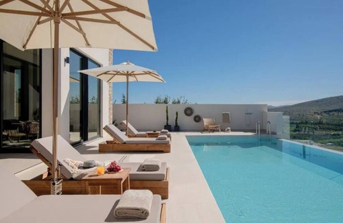 The villa is fully equipped with all amenities required to comfortably host either 3 adult pairs or a 6-member family. 120 sqm of interior + 100 sqm of exterior space + a private pool, will offer all you need to experience a unique stay. Consisted of 3 bedrooms and 3 bathrooms, desk space in each bedroom, a fully equipped kitchen and a spacious living room with a fireplace, electric shaders, luxurious mattresses, linen and towels, high-speed internet, TV with streaming services, high end deck chairs, sunbeds and more, will make you want to stay forever.
