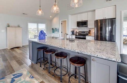 Want to relax at home? You have so many choices! Anchors Away is not only close to the beach access – have your toes in the sand in no time with only 3 houses between you and the ocean - but you also have your own private pool with ample patio seating, string lighting, fans, and a picnic table and hot tub. There are enough decks to spread out and enjoy the view, with glimpses of the ocean and lighthouse - and a screened in porch to enjoy the great sea breezes and sunsets. Wait until you see the granite island and bar, the perfect happy hour gathering! You will have plenty of help in the fully equipped kitchen.