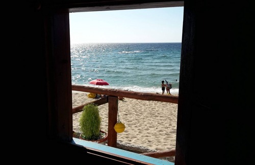 Small house directly on the sand with a large terrace overlooking the sea. Distance from water 8 meters.