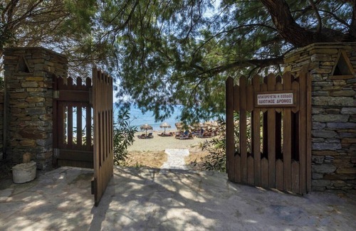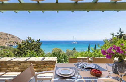 An exquisite villa set in idyllic location, surrounded by green slopes and the turquoise waters of the Aegean, just a few meters away from a sandy beach. This is a graceful, elegant and comfortable home, ideal for family or group vacations. Just a short drive from the island’s handsome main town, a short walk from a lovely village, yet still tranquil and private with gorgeous sea views, our villa is the perfect spot to relax, refresh and regenerate.The residence, set in one level with a few steps leading to the bedrooms, has been built in keeping with the local architecture, using local stone and featuring wooden elements and whitewashes walls. From its garden, verandas and outdoor spaces you will savor the Aegean sea, take in the island’s atmosphere and relax in elegance and comfort.The house has a fully equipped retro style kitchen, a dining area that can seat a group of friends or family and a comfortable sitting area with an A/C. There are three spacious and elegant bedrooms one with a double bed and the other two with single beds, put together in order to accommodate either couples or friends. Two of the rooms have ceiling fans and one has an A/C. Outdoors there is a shaded sitting area with fantastic sea view to enjoy with friends and family.Throughout the house you can just look out of the windows and enjoy the incredibly beautiful sea and island views.This is an airy and comfortable space for you to enjoy.You will have access to a fully equipped and independent villa, with a private shaded terrace and a pedestrian road which leads to a beautiful sandy beach.We are only a phone call/email or a text away for anything you need.The residence is set near the village of Stenies, a short drive from the main Andros town Hora, where you will be able to find all essential shopping. It is part of a group of five homes, all with private entrances and private outdoors areas. All five homes have direct access to a beautiful sandy beach and there is a taverna nearby. 4 km away, in quaint Hora, you will find stylish shops, excellent restaurants, bars and museums, including one of Greece’s best-known modern art museums. Andros is a paradise for walkers, with a number of different trails and also features superb beaches. To best enjoy your stay in our home and Andros we recommend you hire a car. There is free parking on the premises. Hora is just 4 km away and the main port of Andros, Gavrio, around 40km.You can walk down the path to the beach, which also has a beach bar. There is also a taverna 1' up the hill from the villa.For everything else you will need a car.