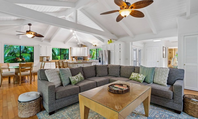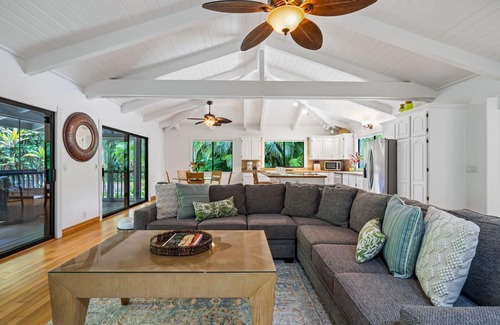 Anini Mauka is a beautiful Hawaiian home tucked away with mature foliage all around, creating a private oasis. A short 5-minute drive will take you to the town of Kilauea for fun activities, shopping and dining. A little further north in about 10-minutes you'll reach the towns of Princeville and Hanalei with even more great dining, beaches, shopping and activities