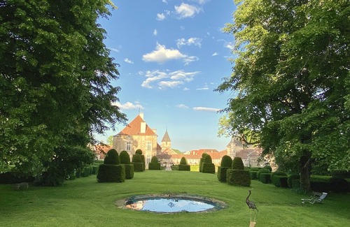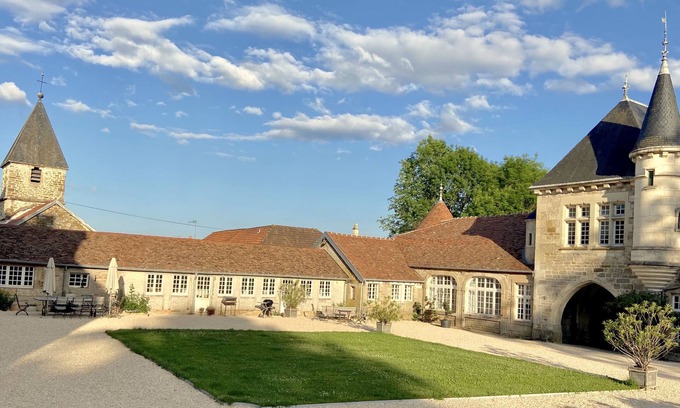 Attached to a beautiful 12th/18th century castle, between Champagne and Burgundy, the outbuildings and the tower have been recently fitted out. A little apart in the parc, a large private and secure swimming pool (20x5,5m), heated, is open from mid-May. The large living area with lounge area, large table for meals, children's corner and open kitchen gives a very friendly spirit to the place. Children and adults can live together, each having their own space. The rooms, very bright, all open onto the courtyard. The large tower is arranged as a studio in its own, and allows for independence (kitchenette and bathroom). From the living room, you can see your children playing in an enclosed courtyard. The castle part remains unoccupied during your stay in the annex. The view of the old part of the castle and the gardens enliven all the rooms. The countryside is beautiful all year round, life is sweet. The shops are accessible by car (bakery and supermarket at 5km).