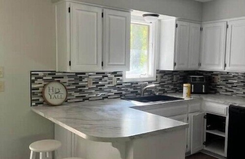 Sleeps up to 8 people with 3 bedrooms and 2 bathrooms. Fully equipped kitchen, with morning coffee provided. A living area, sunroom, and a backyard with a fire pit for roasting marshmallows or playing catch. Outdoor seating around the fire pit and inside the gazebo.
