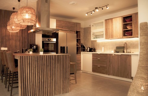a fully equipped open kitchen (oven, microwave, coffee machine, dishwasher, etc.),