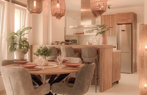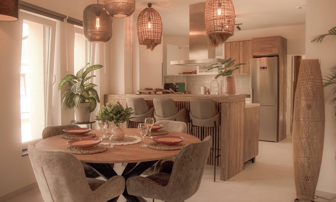 From the moment you step in, you’ll be immersed in a warm atmosphere of natural wood, light textiles, earthy tones, and decorative touches inspired by the Island of the Gods. Each bedroom evokes a unique getaway: Ubud the bohemian, Kuta the sophisticated, Canggu the relaxing, and Sanur the escape — creating a stay filled with serenity and refinement.