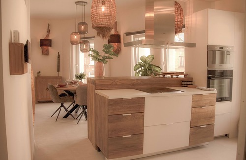 a fully equipped open kitchen (oven, microwave, coffee machine, dishwasher, etc.),