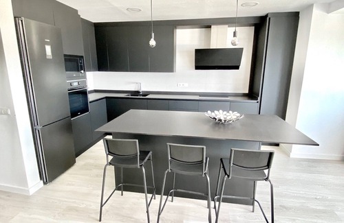1 baño completo con ducha, cocina totalmente equipada con lavavajillas, microondas, horno e isla.
