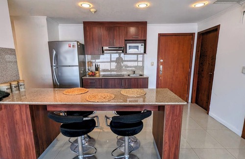 Completamente amoblado, cocina equipada, TV 60 plg para que disfrutes de tus películas y series favoritas.