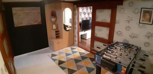 Food & DrinkTea/Coffee makerBathroomToilet, Bathtub, Towels, Bathtub or shower, Shared toilet, Shared bathroom, Shower, Slippers, Body soapMedia & TechnologyTV, Flat-screen TVKitchenMicrowave, Stovetop, Refrigerator, Electric kettle, Dishwasher, Cleaning products, Kitchen, Dining table, Wine glasses, Kitchenette, Oven, KitchenwareLiving AreaSofa, Sitting area, Dining areaGeneralHeating, Fan, Hardwood or parquet floors, Carpeted, Fire extinguisher, Interconnecting room(s) available, Carbon monoxide detector, Trash cans, Smoke Alarm, Soundproof, Key accessBedroomExtra long beds (> 6.5 ft), Linens, Wardrobe or closetViewView, Garden viewOutdoorsOutdoor furnitureAccessibilityUpper floors accessible by stairs onlyBuilding CharacteristicsPrivate apartment in building, Semi-detachedRoom AmenitiesDrying rack for clothing, Socket near the bed, Clothes rack, Non-feather pillowEntertainment & Family ServicesBoard games/puzzlesCleanliness & disinfectionHand sanitizer |
