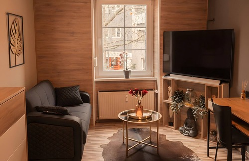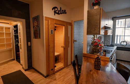 Apartment No. 1 in Trier offers luxurious 55 m² of space for up to 4 guests. It features one bedroom, a living room, a bathroom, and an infrared sauna. The apartment is accessible without steps inside. In your private, fully equipped kitchen, you can prepare meals as you wish. Wi-Fi suitable for video conferences, two TVs, a fan, a dishwasher, and a coffee machine with pods are available. A workspace is also provided. The sights of the city center can be reached in about 5 minutes on foot.