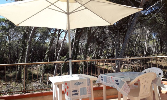 Apartment immersed in the pine forest, a stone's throw from the sea, consisting of: bedroom with double bed and single foldaway bed, private bathroom with sink, bidet, toilet and shower cubicle, living area with equipped kitchen, bunk bed, TV, Wi-Fi -fi, air conditioning. Large outdoor area equipped with umbrella, tables and chairs. Possibility of private parking with obligation to hand over the keys. Pets are accepted. In the immediate vicinity: free and equipped beach, 3 bars, 4 restaurants and the Fort of Marina di Bibbona.