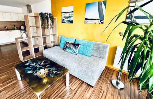 Barrier-free studio for 2 persons, with balcony, shower / WC, radio, WLAN, hairdryer, safe, kitchen with electric stove, dishwasher, sink, refrigerator, espresso machine, kettle, toaster