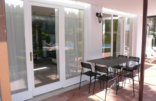 Outside there is a veranda for enjoying meals outdoors, looking out over the pool. Two sun loungers are available.