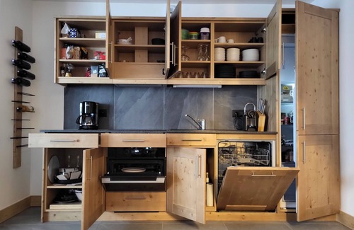 Spacious living room with fully-equipped kitchen opening onto terrace (view of valley and slopes).