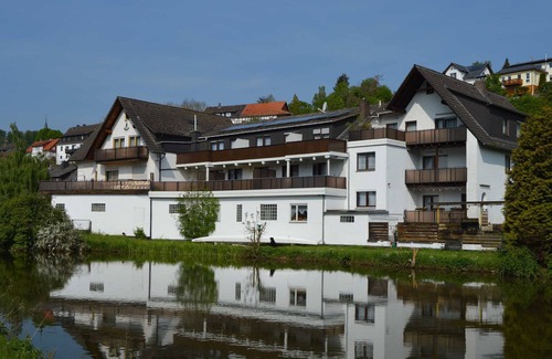 38 total beds (12 apartments) Now with breakfast service !!! Located directly on the Vorstaubecken the Edersee in Waldeck-Niederwerbe. Modern furnished apartments of 32-50 and 110 m2, with balcony, kitchenette with full equipment, microwave, oven, toaster, central heating, shower / WC, WiFi, satellite TV, radio, covered patio with barbecue and lawn on the water, coin-operated washing machine and - Dryer, sailor and camping shop in the house. We are open all year round.