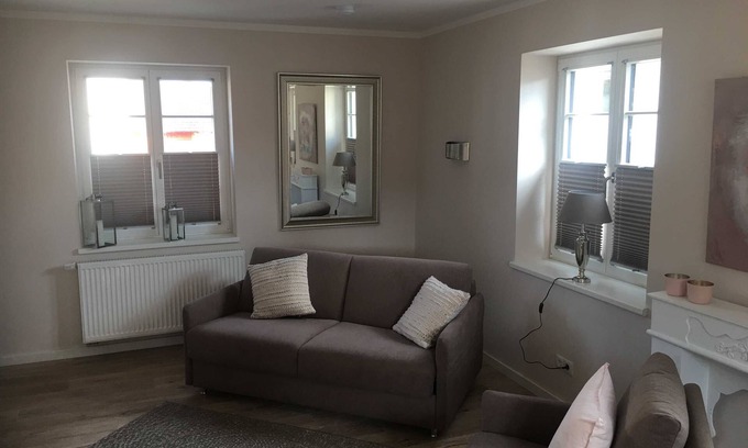 Apartment A is located on the ground floor. The approximately 40 square meters of living space are distributed in the living and sleeping area and the bathroom. It is designed for 2 to 4 people. For the third or fourth person, a high-quality sofa bed is available. Other features: • cozy ambience • comfortable seating in the living room • free Wi-Fi • LED TV • small kitchen with fridge and ceramic hob • Tchibo Cafissimo coffee machine with capsules and accessories • modern shower room with high-quality makeup mirror, towels and hair dryer