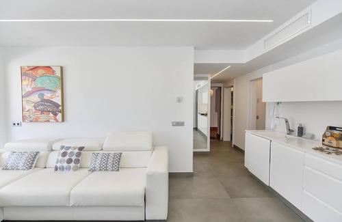 Located in an exclusive and very quiet complex with a communal pool and beautiful gardens with direct access to the promenade, this apartment has two bedrooms, a complete bathroom with hydromassage shower and a spacious kitchen-living room. The main bedroom has a double bed and the second bedroom, as can be seen in the photos, has two crossed beds as a bunk-bed not suitable for people with reduced mobility.