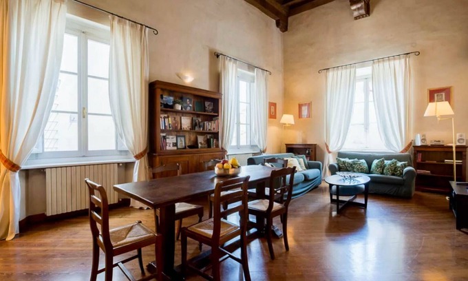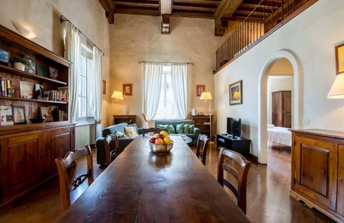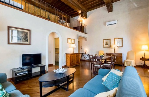 Set in the vibrant heart of Florence’s historic Santa Croce district, this beautifully appointed two-bedroom apartment offers an inviting retreat just moments from the city's most iconic landmarks. From the fourth floor of a characterful building with a lift, guests can enjoy sweeping views and a peaceful atmosphere above the bustling streets. Inside, natural light pours through large windows, illuminating a double living room, a spacious kitchen, and two thoughtfully designed bathrooms—one with a bathtub for long, relaxing soaks. The mezzanine-level bedroom adds a unique architectural touch, ideal for those seeking a distinctive stay.