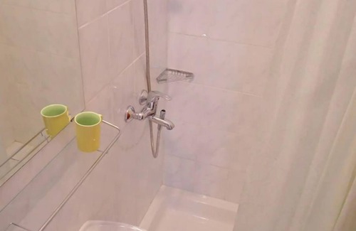 BATHROOM (1): Equipment in the bathroom: shower, toilet, tiles, bath towels.