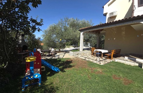 The spacious apartment Angie 1 is located in a family house in Njivice on the island of Krk, only 500 meters from the sea. This apartment consists of four bedrooms, two bathrooms with shower, kitchen, and living room, and can host up to 10 people. The apartment is located on the ground floor, is air-conditioned, and has a washing machine and a dishwasher. The apartment has a terrace and a barbecue. Pets are welcome in this family house with an additional charge.