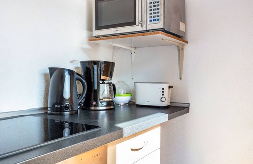 The apartment has a living and sleeping area as well as a kitchen equipped with a refrigerator, ceramic hob, microwave, coffee machine, and kettle.