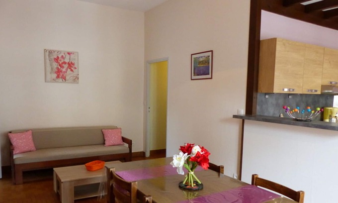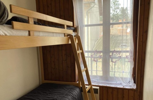 Communal gîte in apartment in the village. On the ground floor of an independent house with meeting room, fireplace, games room, washing machine shared with the other gîtes in a laundry room in the basement, shared courtyard. Living room/kitchen area, 1 bedroom + 1 alcove ideal for children (1 double bed, 2 bunk beds). Shower room (shower), separate toilet. Guest rooms on site. Tourist tax. Vichy 32 km. Saint Clément lake 16 km. Non-smoking cottage. There are approximately 10 steps to climb from the courtyard/parking lot to all accommodation. Premises equipped for digital reception. Bathroom linen provided with sheet rental. Heating and electricity payable by the customer to be paid on site at the end of the stay. Flat screen TV, Optional cleaning, Dishwasher, Optional linen, Electric heating, Garden furniture, Microwave, Wifi or Internet, Garden, Freezer, conv, Last minute rental, Parking. Option to be paid on site: - Optional end-of-stay cleaning: €80. - One pair of sheets per bed. : €10. Property managed by a professional. Unless stated, services such as cleaning, bed linen, towels etc. are not included in the price of this rental. If pets are allowed (information in the advertisement), charges may be applicable. Only equipment mentioned in this advertisement are present. Equipment not mentioned are not considered to be present.