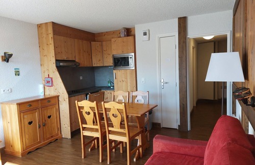Séjour avec balcon, canapé 2 lits gigognes en 90, 1 télé, coin-cuisine : 1 grand frigo avec freezer, 1 lave-vaisselle, 1 four multifonction, 1 plaque vitrocéramique 4 feux, 1 hotte, 1 cafetière, 1 bouilloire avec température réglable, 1 grille-pain, 1 four à raclette, 1 set fondue au fromage.