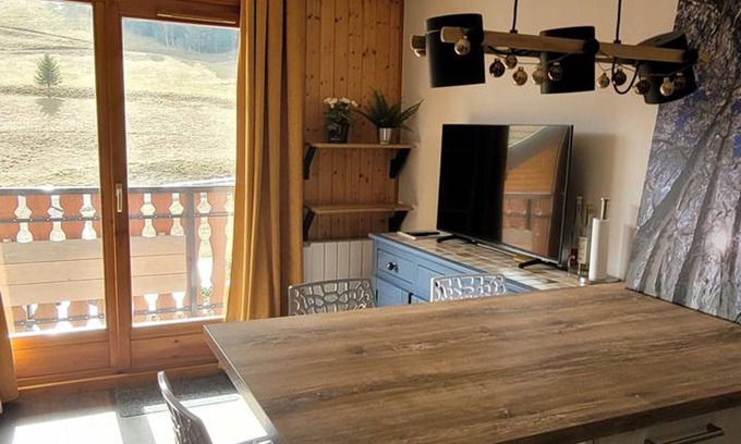- a dining area with a table, 4 adjustable bar chairs, 2 low stools, 1 sideboard, storage. This space opens onto a south-east facing balcony with a view of the mountains