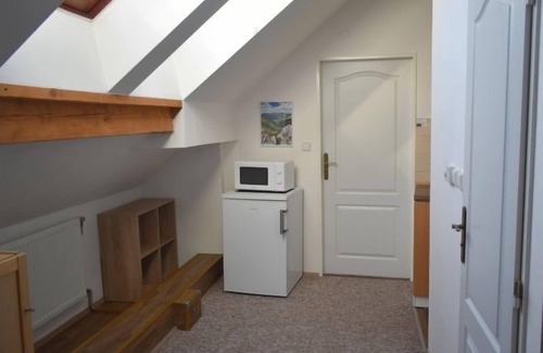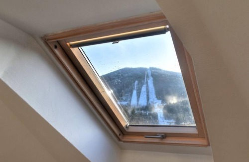 "Harrachov Central Nook", 2-room apartment 56 m2 on 2 levels, on the top floor. Entrance hall. Upper floor: (spiral staircase) living/sleeping room with sloping ceilings with 1 bed, 1 double bed and satellite TV. 1 room with sloping ceilings with 1 double bed and dining table. Kitchenette (2 hot plates, kettle, microwave, electric coffee machine). Shower/WC. View of the countryside. Facilities: Internet (WiFi, free). Parking space n 43 (1 car). Please note: suitable for families. Non-smokers only. HARRACHOV CARD guest card included in the price.