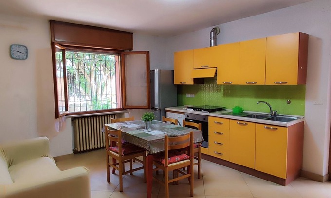 Internal parking for bikes. Comfortable apartment with outdoor garden, table and chairs. It has a washing machine, 32 'LCD TV, free Wi-Fi, all linen and kitchen equipment. It is composed of a kitchen with a sofa, a bathroom and two rooms.