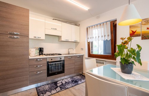 "Cima", 3-room apartment 50 m2, on the upper ground floor. Modern and cosy furnishings: living/dining room with dining table and TV. 1 room with 1 double bed. 1 room with 2 beds. Open kitchen (4 hot plates, oven, freezer, electric coffee machine). Shower/WC. Gas heating. Heating available only from 15.10. to 30.05. Terrace. Terrace furniture, barbecue, deck chairs, box-room. Panoramic view of the mountains. Facilities: Internet (WiFi, free). Please note: non-smoking house. Maximum 2 pets/ dogs allowed. IT007019C2VZURXXPR