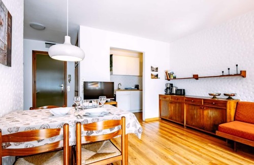 2-room apartment 40 m2, on the ground floor. Practical and comfortable furnishings: living/dining room with 2 sofabeds, dining table and TV (flat screen). Exit to the terrace. 1 double bedroom. Small kitchen (4 hot plates, oven, toaster, kettle, microwave, electric coffee machine, Capsules for coffee machine (Nespresso)). Shower/bidet/WC. Terrace 12 m2. Terrace furniture. Very beautiful view of the mountains.