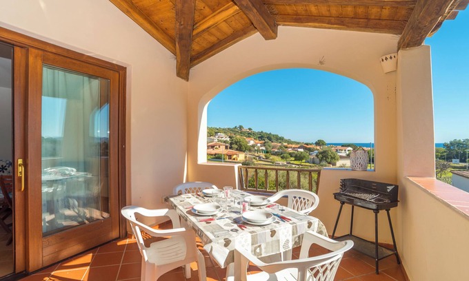 In the northeastern commune of Budoni in Sardinia, this holiday apartment with a great sea view is just a short walk from both the centre and the beautiful beach of Porto Ottiolu. Located on the first floor, the apartment consists of a spacious living room with a sofa bed, a kitchenette, one bedroom as well as one bathroom with beautiful Sardinian tiles. The property can therefore accommodate 4 people. Additional amenities include air conditioning, a washing machine and a baby cot. In the outdoor area you will find a spacious, covered balcony with a dining table, a barbecue and an amazing view of the glittering sea. You can reach both the marina and the central town square, with shops, restaurants and cafes, in 8 minutes walking (600 m). The white beach of Spiaggia di Porto Ottiolu and the crystal clear sea furthermore await you just 1.2 km or a 15-minute walk from your front door. Here you can do water sports under the warm sun and go on sailboat excursions to explore the area.