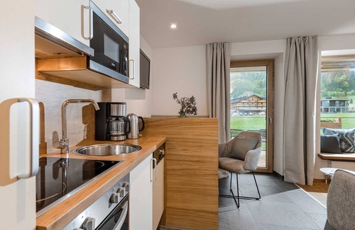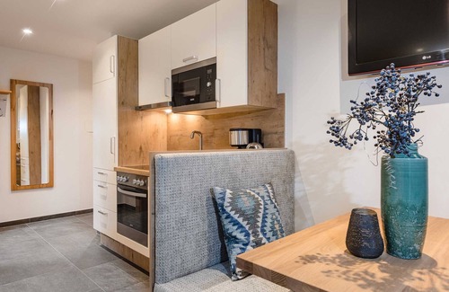 Apartment Deluxe ca. 40 m²Apartments with private bedroom, modern bathroom with shower / WC, radio, hairdryer, cosmetic mirror cozy kitchen with dining and living area kitchenette with electric stove, oven, microwave, and dishwasher radio, telephone, safe, satellite TV, balcony and real Parquet floor equipped.