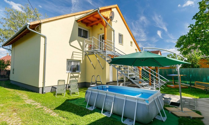 Balatonkeresztúr 20 km from Keszthely: Modern 2-family house, 2 storeys in 2022. 570 m from the lake, 700 m from the beach. Private: garden (fenced), swimming pool (above ground) (3 x 2 m, seasonal availability: 01.Jun. - 15.Sep.). Garden furniture. In the house: WiFi, central heating system, air conditioning, washing machine. Parking (for 2 cars) on the premises. Grocery 260 m, supermarket 9 km, restaurant 800 m, bakery 500 m, café 450 m, bicycle rental 8 km, thermal baths "Hévíz" 25 km. Sailing school 1 km, tennis 900 m, cycle lane 50 m, children's playground 450 m. Nearby attractions: Bella Zoo Siófok 73 km, Szántód Ferry 52 km, Adventure Park Zamárdi 60 km, Festetics Castle 20 km, Hévíz Thermal Bath 25 km, Kis-Balaton Visitor Centre 14 km.