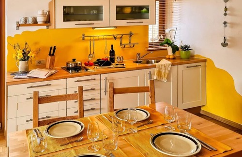 The apartment EARTH is very cozy, completely furnished and can accommodate max. 4 people. The kitchen is equipped with: Dishwasher, water cooker, filter coffee machine, moccham machine, double ceramic hob, sink, refrigerator with freezer, cutlery, cookware, glasses, plates, bowls, In the kitchen there is a dining table with 4 chairs.