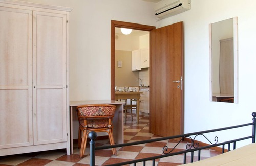 2-room apartment 39 m2. Beautiful furnishings: living/sleeping room with 1 double sofabed, dining table, satellite TV, electric heating and air conditioning. 1 double bedroom. Open kitchen (4 hot plates, toaster, microwave). Shower/bidet/WC. Balcony or terrace. Terrace furniture. Parking at the house. Please note: fridge without freezer. 1 small pet/ dog allowed. Private entrance. IT023022A1JCD6ECPW