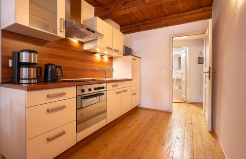 In this charming holiday flat, located on the 1st floor, you will enjoy historical charm in every corner. The exposed wooden beam ceilings give the well-kept living area a warm, inviting touch. For your convenience, the living and sleeping area is skilfully designed in a studio layout, complemented by a fully equipped eat-in kitchen with ceramic hob, filter coffee machine, kettle and mini oven, which invites you to linger and self-cater.