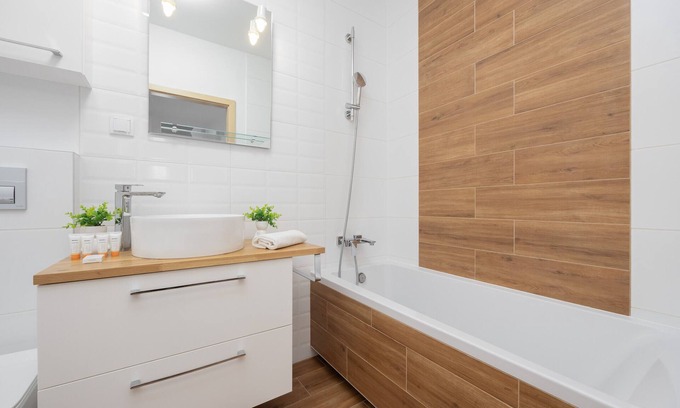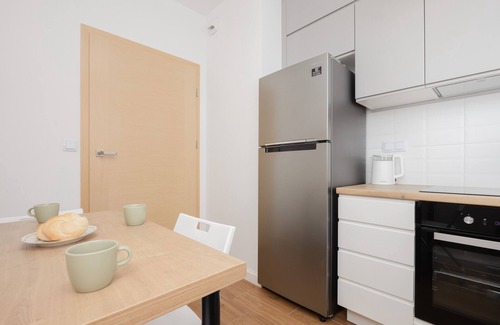 The bright 50.69 m² apartament is ideal for a stay of up to four people. It consists of two comfortable bedrooms, an independent kitchen, an elegant bathroom and a cosy balcony. The first bedroom has a comfortable sofa, a TV, a practical chest of drawers and a table with four chairs, ideal for dining or spending time with loved ones. There is also a furnished balcony where you can enjoy relaxing in the fresh air. The second bedroom has been designed with comfort in mind - there is a spacious double bed and a desk, creating the perfect environment for remote working. The kitchen is fully equipped with a fridge, oven, dishwasher, microwave and electric kettle, allowing you to prepare meals at home. In addition, there is a table with three chairs, ideal for everyday meals. The bathroom, decorated in a harmony of white and wood, offers full comfort - there is both a shower and a washing machine, making this flat ideal for longer stays. The flat also comes with a parking space in the underground garage. This flat is an ideal choice for families, couples or business travellers looking for comfort and convenience.