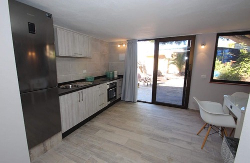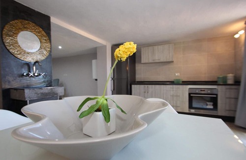 A separate living room with flatscreen TV, De Sede sofa, eat-in kitchen with dining area and kitchenette, with coffee machine, kettle, toaster, etc. Note: The bedrooms are not directly accessible from the living room. Apartment 1 with private entrance, bedroom with double bed 180x200, bathroom en suite. Apartment 2 with private entrance, bedroom with double bed 180x200, bathroom en suite. Terrace with sun loungers.